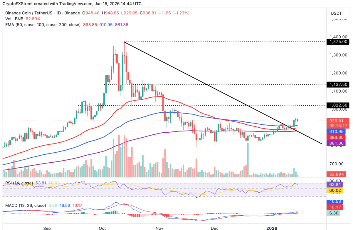 Giá BNB hiện vẫn giữ vững vị thế trên các đường trung bình động quan trọng. Tại thời điểm viết bài vào thứ Sáu, BNB đang giao dịch phía trên EMA 200 ngày và EMA 50 ngày quanh vùng 881 USD, đồng thời duy trì trên EMA 100 ngày tại 991 USD — một tín hiệu cho thấy cấu trúc xu hướng trung hạn vẫn nghiêng về phía tích cực.
