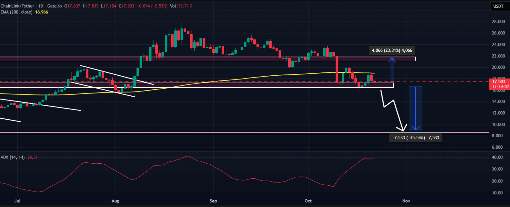 Nếu giữ vững 16,4 USD, LINK có thể phục hồi lên 21,5 USD, ngược lại nếu thủng, giá có thể lao về vùng 8,7 USD — tương đương mức giảm 45%.