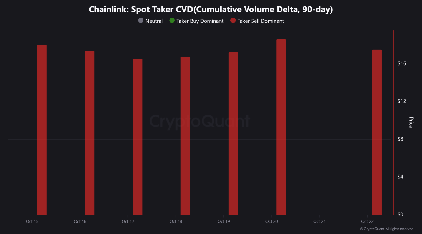 Từ 15–22/10, lượng Taker Sell liên tục vượt Taker Buy – một tín hiệu cho thấy dòng vốn đang rút dần khỏi LINK.