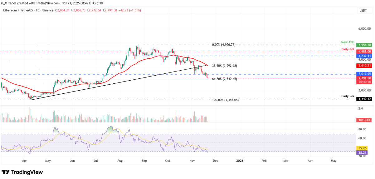 Nếu đà giảm tiếp tục, ETH nhiều khả năng sẽ kiểm tra mức Fibonacci 61,8% tại 2.749 USD.