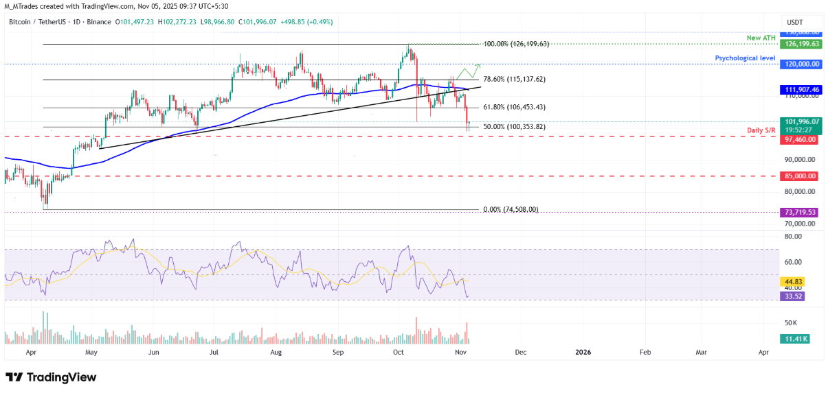 Giá Bitcoin đã vấp phải lực bán mạnh quanh đường xu hướng bị phá vỡ trước đó vào thứ Hai, khiến tiền điện tử này lao dốc 8,18% trong phiên kế tiếp và quay lại kiểm tra mức Fibonacci thoái lui 50% tại 100.353 USD. Đến trưa thứ Tư, BTC dường như đã tìm được điểm tựa quanh vùng giá này, ghi nhận sự phục hồi nhẹ lên trên mốc 102.000 USD.