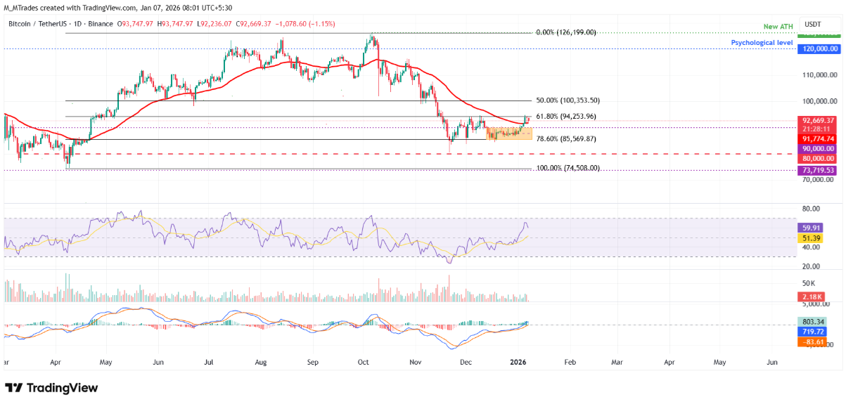 Trong kịch bản tích cực, nếu BTC đóng cửa dứt khoát trên mốc 94.253 USD, xu hướng tăng có thể được nối dài, mở ra dư địa tiến tới mốc tâm lý then chốt 100.000 USD.
