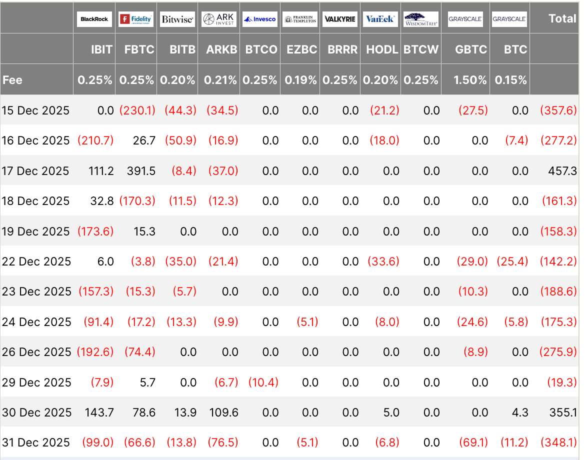 Ở thời điểm hiện tại, bức tranh rõ ràng nhất cũng là dữ kiện đơn giản nhất: các quỹ ETF Bitcoin giao ngay tại Mỹ đã kết thúc giai đoạn từ 15/12 đến 31/12 với tổng dòng vốn rút ròng khoảng 1,29 tỷ USD.