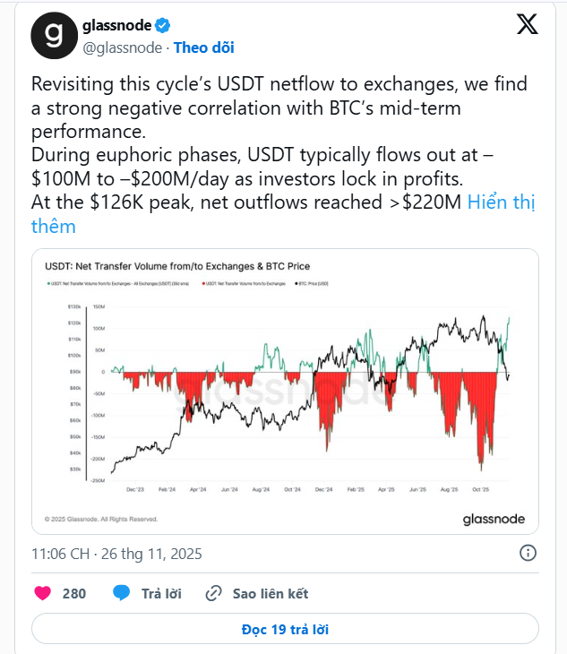 Dữ liệu mới từ Glassnode cho thấy một xu hướng đáng chú ý: dòng tiền USDT rút khỏi các sàn giao dịch thường trùng với giai đoạn giá Bitcoin tăng lên. Mối tương quan âm mạnh giữa hai tài sản này đã duy trì liên tục trong suốt hai năm qua.