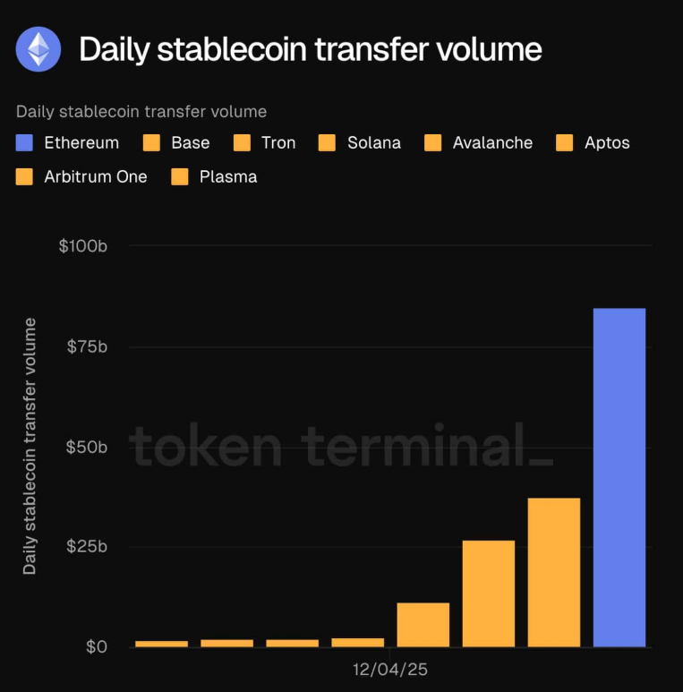 Khối lượng chuyển stablecoin hàng ngày trên Ethereum đã vượt 85 tỷ USD, dẫn đầu toàn thị trường blockchain. Tổng giá trị stablecoin luân chuyển trong quý 4/2025 đã cán mốc gần 6.000 tỷ USD, vượt xa toàn bộ quý 3 – và quý này vẫn chưa kết thúc.