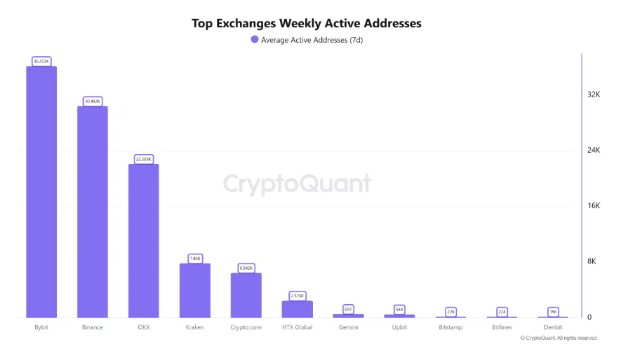 Bybit vẫn dẫn đầu về số lượng địa chỉ hoạt động trung bình mỗi tuần, nhưng lại chịu tác động nặng nề nhất khi mất hơn 12.900 địa chỉ, tương đương mức giảm 26,39%. Trong khi đó, Binance và OKX cho thấy khả năng giữ chân người dùng tốt hơn, với mức sụt giảm lần lượt chỉ 5,04% và 4,1%. Đáng chú ý, thị phần địa chỉ của Binance tăng từ 25,6% lên 28,3%, cho thấy dòng thanh khoản đang tập trung mạnh vào các sàn lớn và ổn định hơn trong giai đoạn căng thẳng.