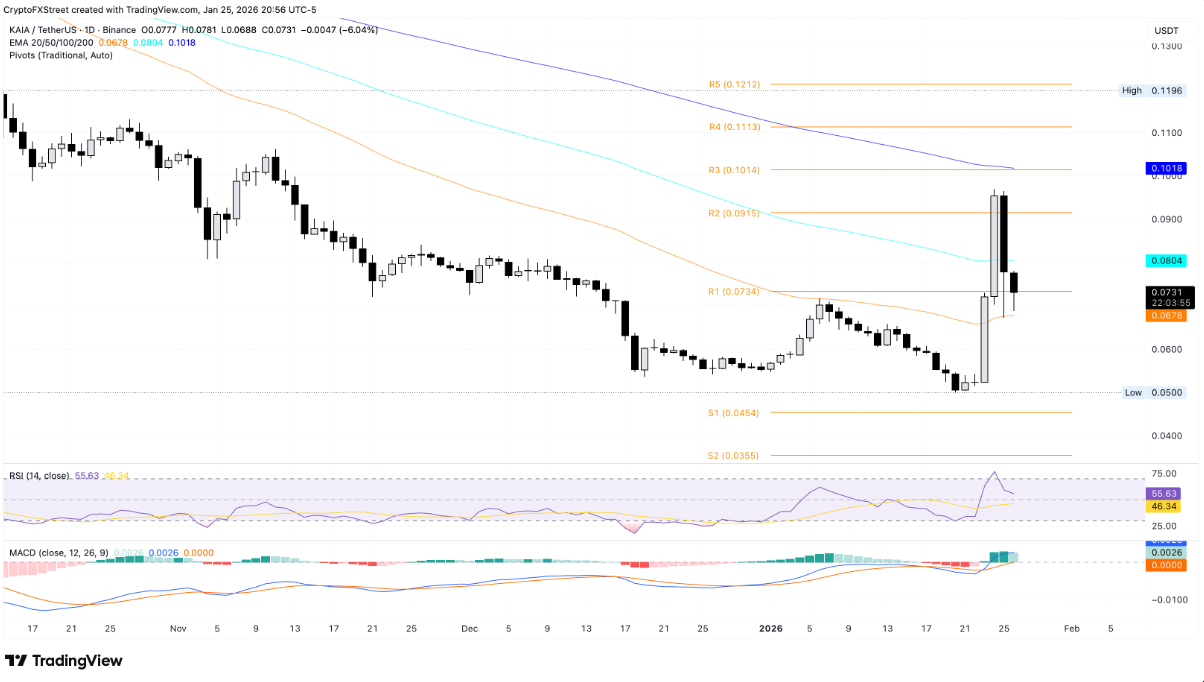 Kaia giảm 6% tại thời điểm viết bài vào thứ Hai, qua đó nối dài đà lao dốc lên tới 18% kể từ Chủ nhật. Diễn biến điều chỉnh này đang đặt KAIA trước nguy cơ xóa bỏ toàn bộ mức tăng 32% ghi nhận trong ngày thứ Bảy, đặc biệt nếu giá đóng cửa dưới ngưỡng Pivot R1 tại 0,0735 USD.