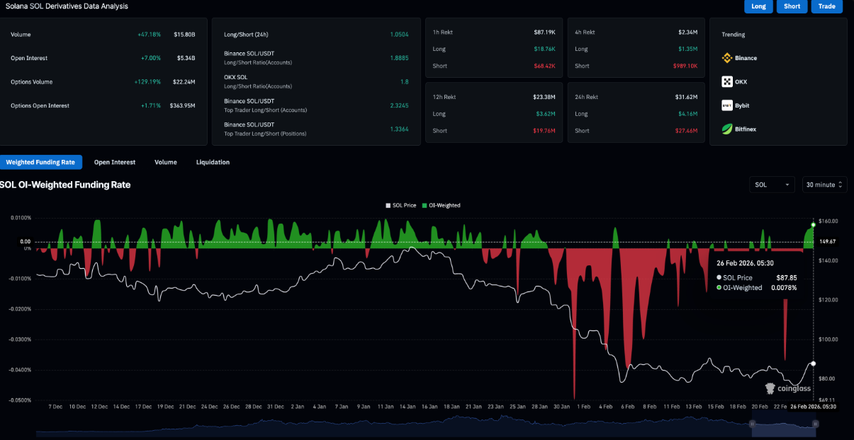 Trên thị trường phái sinh, dữ liệu từ CoinGlass cho thấy hợp đồng mở (OI) của hợp đồng tương lai SOL đã tăng lên 5,34 tỷ USD vào thứ Sáu, tương đương mức tăng 7% chỉ trong vòng 24 giờ. Diễn biến này phản ánh việc giá trị danh nghĩa của các hợp đồng mở đã mở rộng đáng kể, khi trader gia tăng vị thế hoặc sử dụng đòn bẩy cao hơn. Trong bối cảnh lịch sử, OI tăng thường là tín hiệu cho thấy thị trường đang kỳ vọng một biến động giá mạnh theo một trong hai chiều.