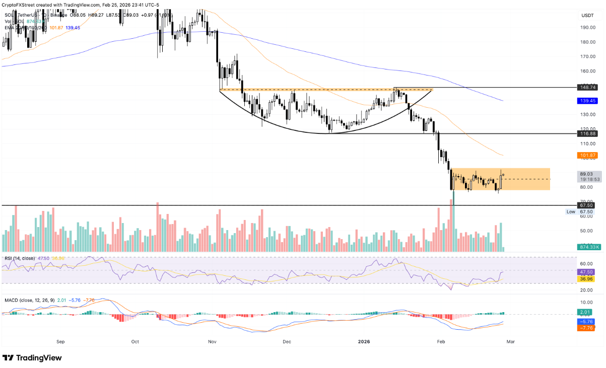 Tại thời điểm bài viết được thực hiện vào thứ Sáu, giá SOL tăng khoảng 1%, qua đó ghi nhận phiên tăng thứ ba liên tiếp. Đà phục hồi này đang diễn ra trong vùng tích lũy hình thành từ đáy 77,60 USD đến đỉnh 93,43 USD thiết lập vào ngày 5/2, cho thấy lực cầu đang dần quay trở lại thị trường.