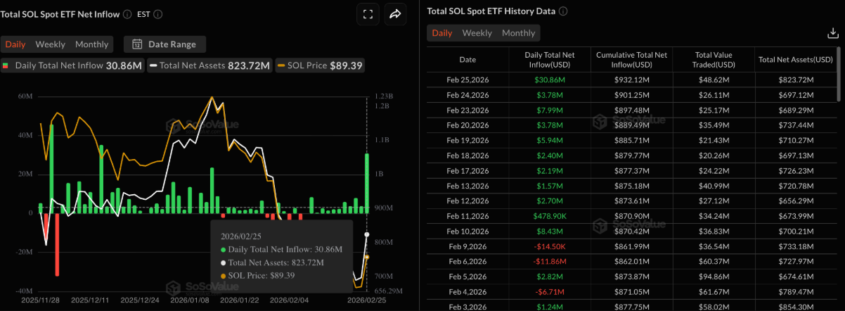 Bất chấp giai đoạn biến động kéo dài suốt ba tuần qua của thị trường, nhu cầu từ khối tổ chức đối với Solana vẫn cho thấy sự bền bỉ đáng chú ý. Các ETF giao ngay SOL tiếp tục ghi nhận dòng tiền ròng tích cực, với 30,86 triệu USD chảy vào trong ngày thứ Tư — đánh dấu phiên thứ 11 liên tiếp hút vốn, qua đó nâng tổng giá trị tài sản ròng lên 823,72 triệu USD.