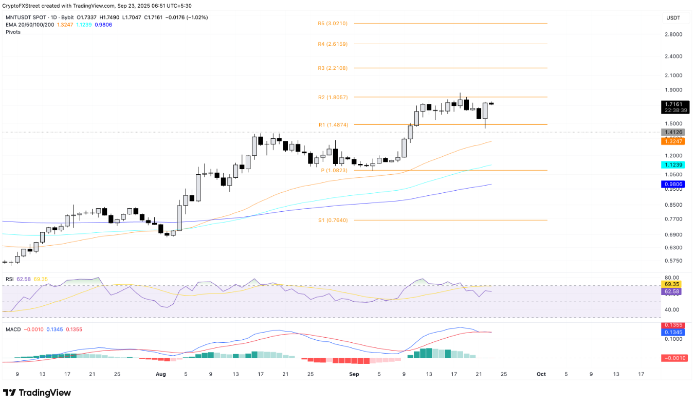 Sau khi tăng 11% phiên trước, Mantle giảm nhẹ 1% và dao động trong vùng 1,48 – 1,80 USD.