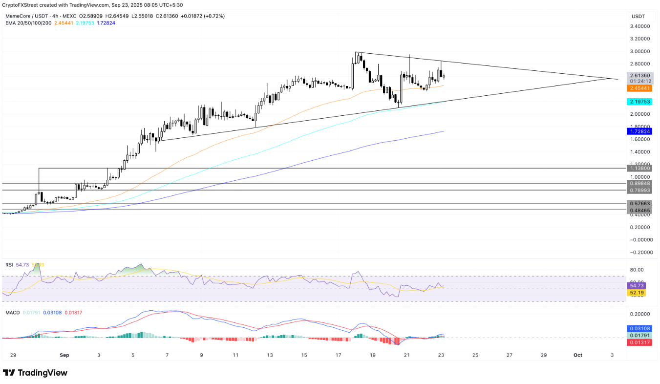 MemeCore đang giao dịch quanh 2,60 USD, tăng hơn 8% trong 24h. Trên khung 4h, giá nằm trong mô hình tam giác cân, hỗ trợ EMA 50 kỳ tại 2,45 USD.