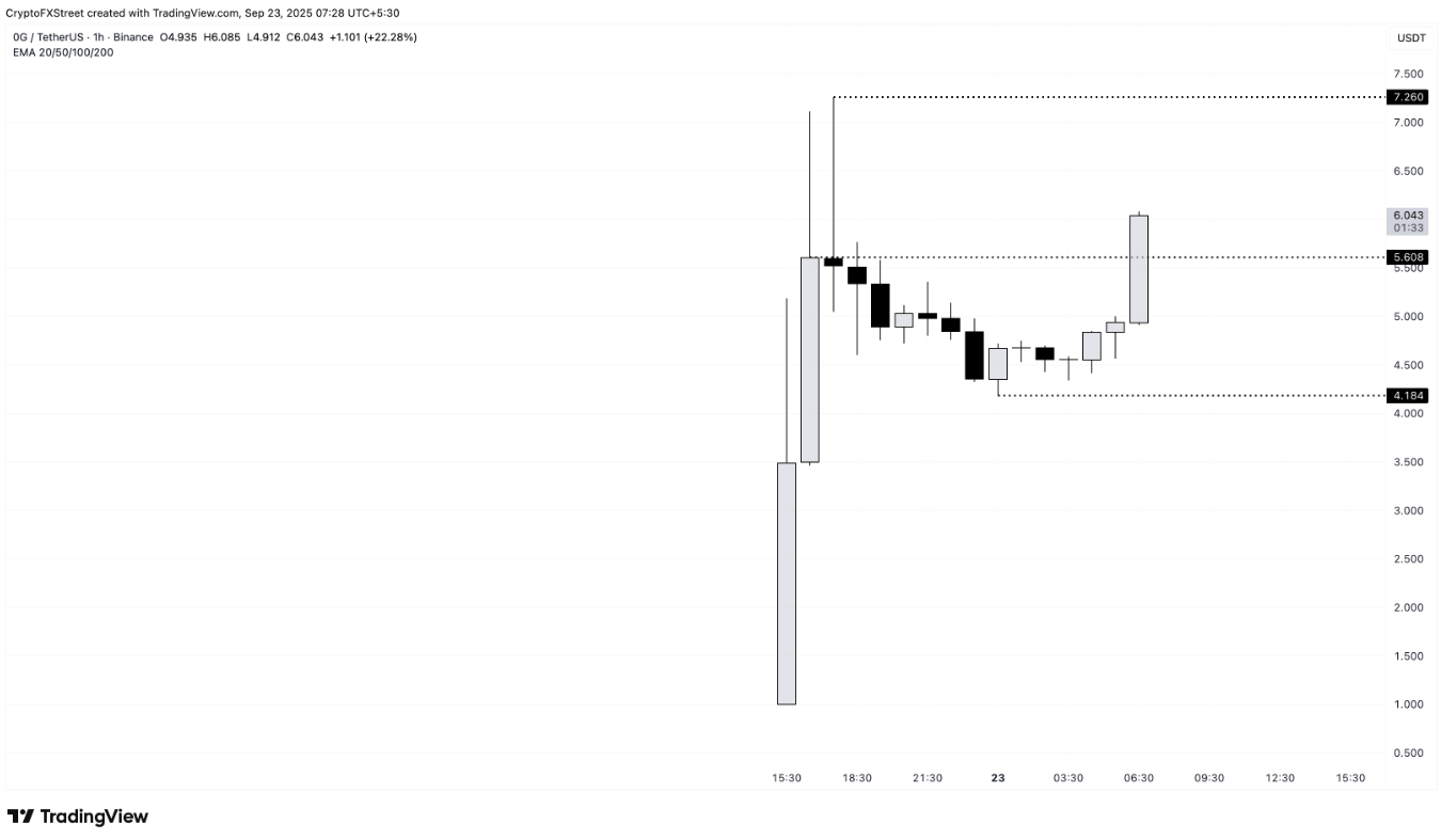 0G Labs vừa niêm yết token trên Binance, giá tăng gần 400% trong ngày đầu và tiếp tục leo thêm 20% lên trên 6 USD. Nếu duy trì ổn định trên mốc này, 0G có thể hướng tới đỉnh 7,26 USD.