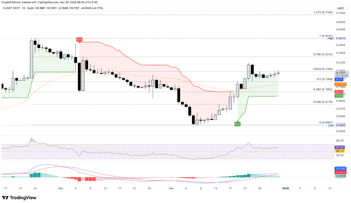 Humanity Protocol (H) ghi nhận đà hồi phục mạnh, bật tăng từ $0,1500 và đánh dấu ngày tăng thứ tư liên tiếp. Tại thời điểm hiện tại, token này tăng gần 3% trong ngày thứ Ba, hướng tới mốc Fibonacci thoái lui 61,8% tại $0,1780, được tính từ mức cao $0,4010 ngày 24/10 và mức thấp $0,0467 ngày 7/12 trên biểu đồ logarit hàng ngày.