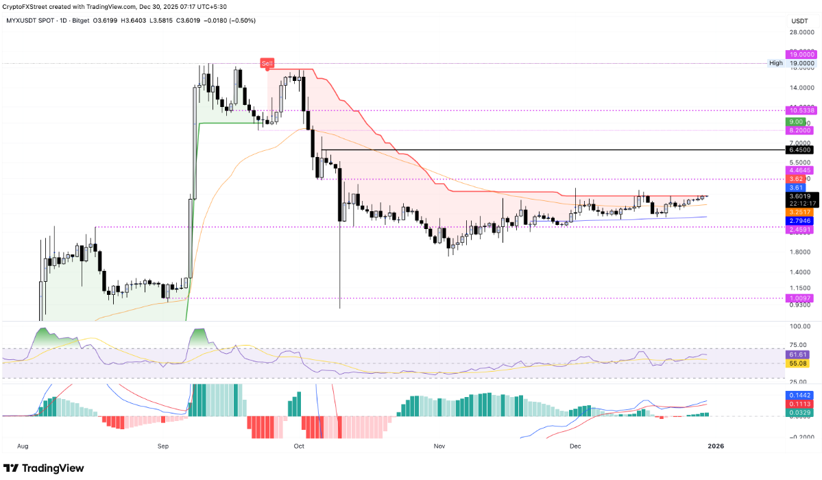 MYX Finance giao dịch quanh mốc $3,50 vào thời điểm cập nhật hôm thứ Ba, nối tiếp đà tăng gần 4% vào thứ Hai. Hiện tại, MYX đang tiến gần đến mức phá vỡ chỉ báo Supertrend tại $3,62 — một tín hiệu tiềm năng cho sự khởi động xu hướng tăng mới và cơ hội mua vào.