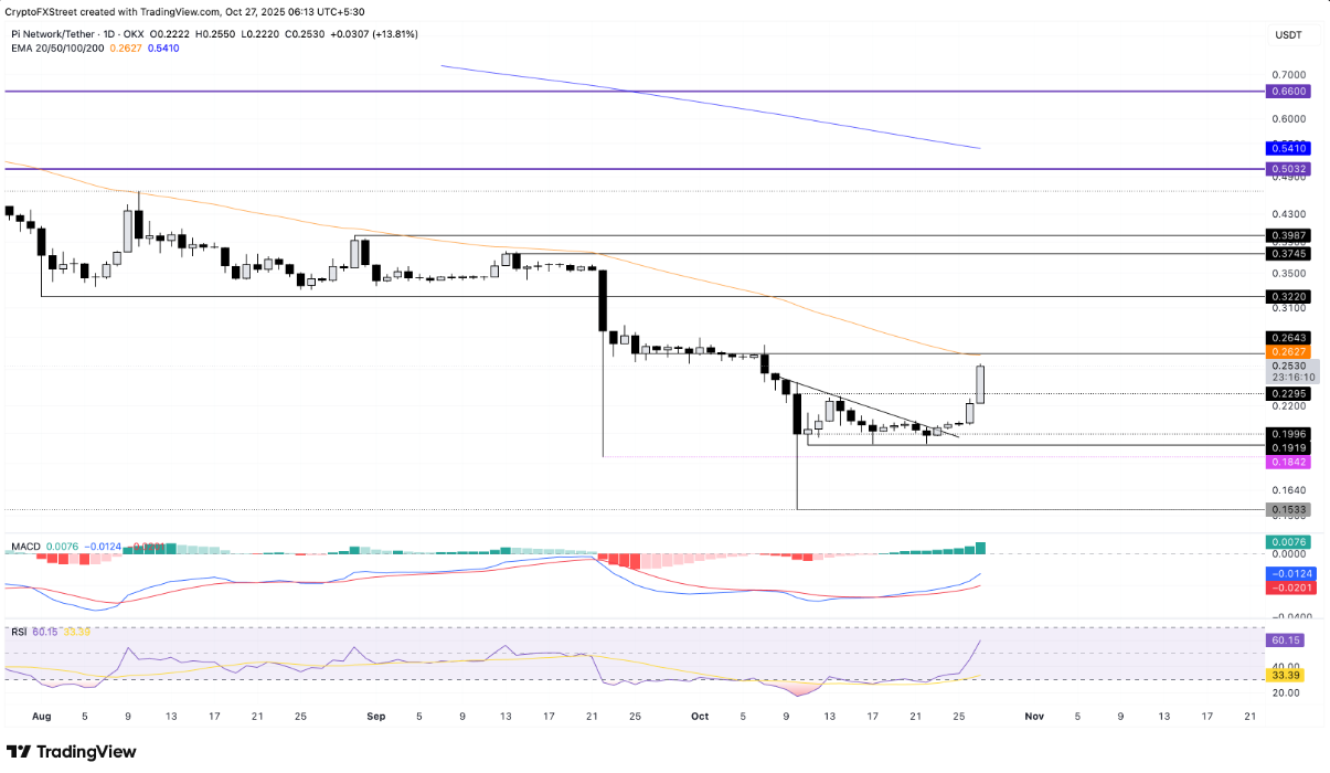 Pi Network (PI) đang giao dịch quanh 0,25 USD, tăng 13% trong 24 giờ.