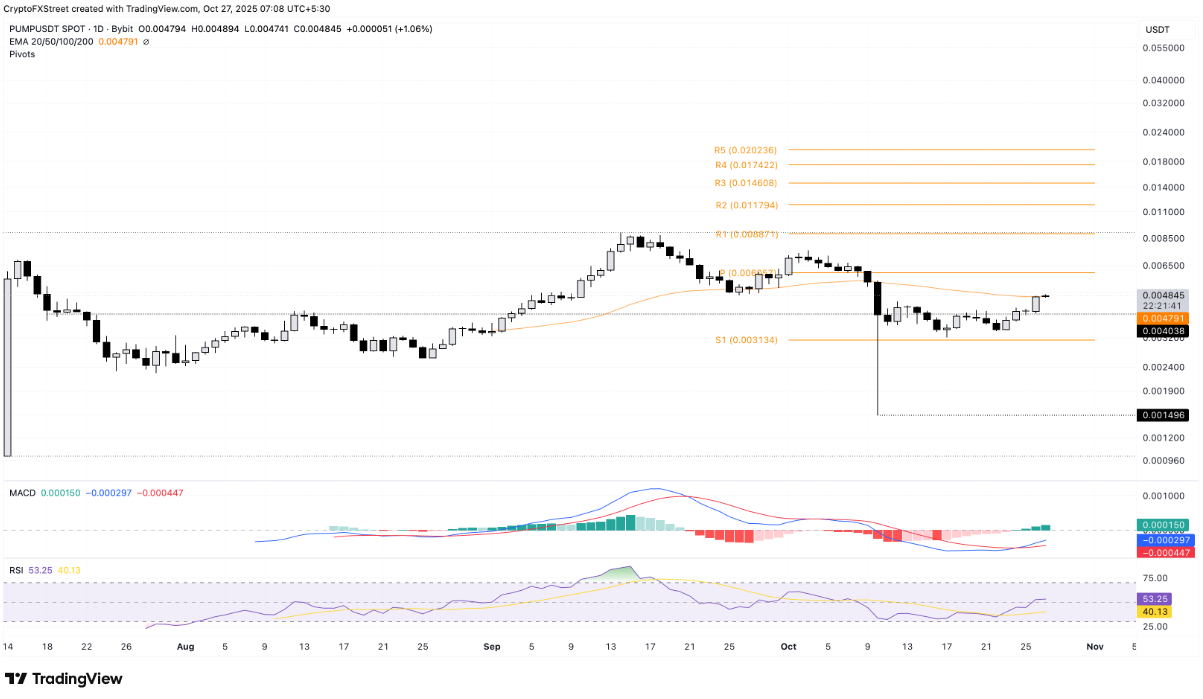 Sau đà bứt phá 15% cuối tuần, PUMP tiếp tục tăng nhẹ 1% trong ngày 27/10, duy trì trên đường EMA 50 ngày (0,004788 USD).