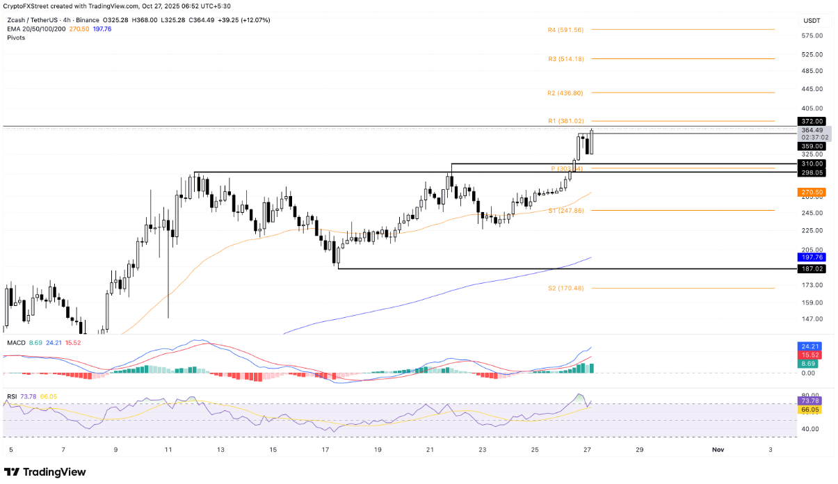 Nếu ZEC đóng cửa vững trên 381 USD, mục tiêu tiếp theo là 436 USD (vùng R2 Pivot Point).